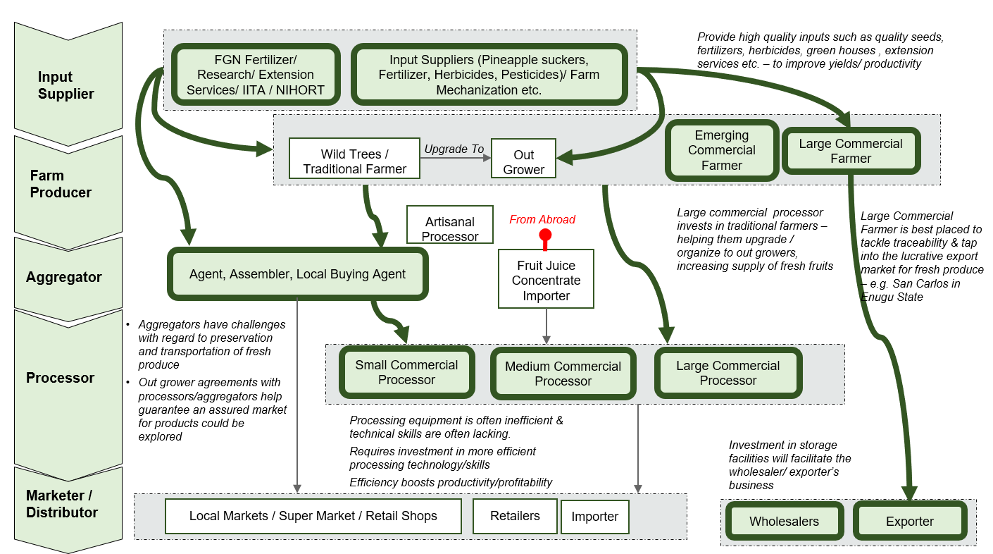 Improving agricultural outcomes in Nigeria is best accomplished by understanding the key constraints to growth in agricultural value chains and removing these constraints. This is illustrated and summarised in the following chart (which identifies the key leverage nodes and actors with potential for large impact in the horticulture value chain). Future articles will address the challenges of improving the key constraints to growth in agricultural value chains.